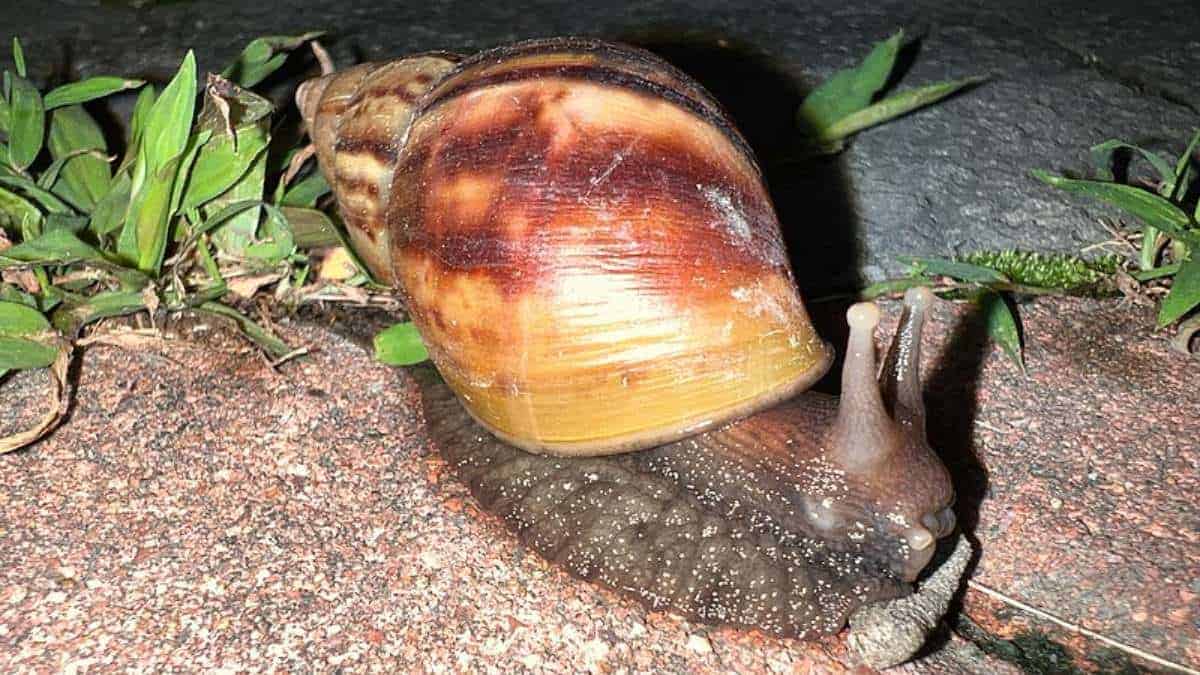 The giant African land snail has a voracious appetite, eating over 500 types of plants and sometimes even consuming plaster and stucco, putting structures at risk. The snails can produce 1,200 eggs in a year and grow up to about the size of a human fist.