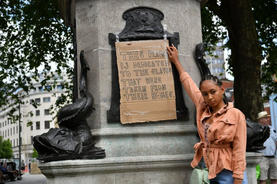 Asha (surname not given), 25, from Bristol places her dedication on the empty plinth where the statue of Edward Colston in Bristol once stood after it was taken down during a Black Lives Matter protest on Sunday. The protests were sparked by the death of George Floyd, who was killed on May 25 while in police custody in the US city of Minneapolis. PA Photo. Picture date: Monday June 8, 2020. See PA story POLICE Floyd. Photo credit should read: Ben Birchall/PA Wire